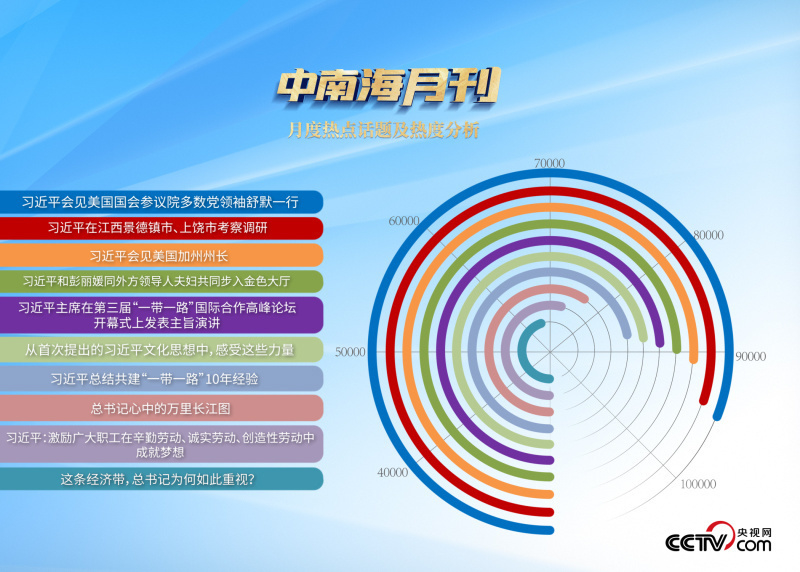 央視網(wǎng)“智聞”系統(tǒng)提取分析10月全網(wǎng)時政新聞熱點顯示,“習(xí)近平主席會見美國國會參議院多數(shù)黨領(lǐng)袖舒默一行”“習(xí)近平會見美國加州州長”“習(xí)近平主持召開進(jìn)一步推動長江經(jīng)濟帶高質(zhì)量發(fā)展座談會”等話題最受網(wǎng)民關(guān)注。