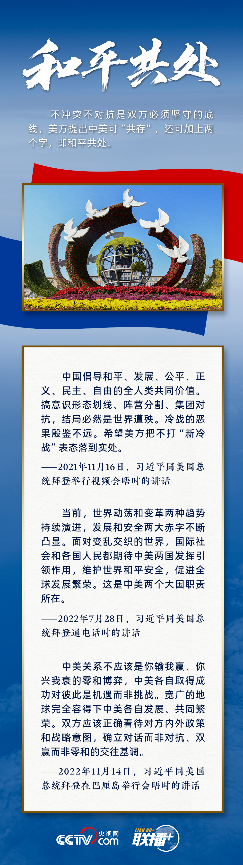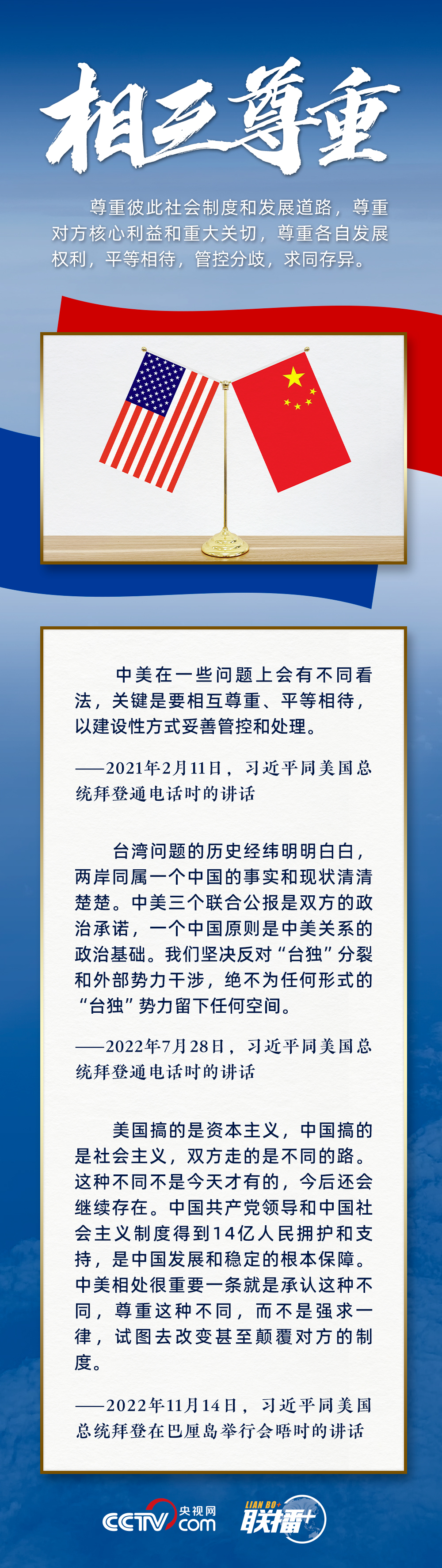 “中美不沖突、不對抗、和平共處,這是兩國最基本的共同利益。”習(xí)主席指出,遵守國際關(guān)系基本準(zhǔn)則和中美三個(gè)聯(lián)合公報(bào),這是雙方管控矛盾分歧、防止對抗沖突的關(guān)鍵,也是中美關(guān)系最重要的防護(hù)和安全網(wǎng)。