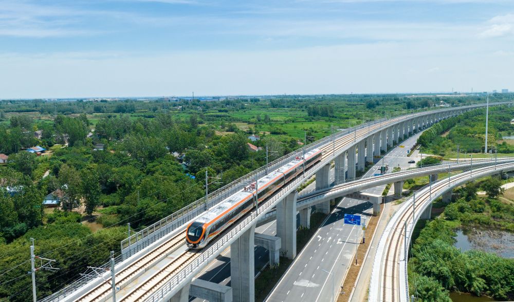 這是在安徽省滁州市來安縣境內(nèi)拍攝的滁寧城際鐵路列車(2023年6月28日攝,無人機(jī)照片)。當(dāng)日,滁寧城際鐵路滁州段開通運營。滁寧城際鐵路西起滁州高鐵站,止于正在規(guī)劃建設(shè)中的南京北站,全長約55公里。