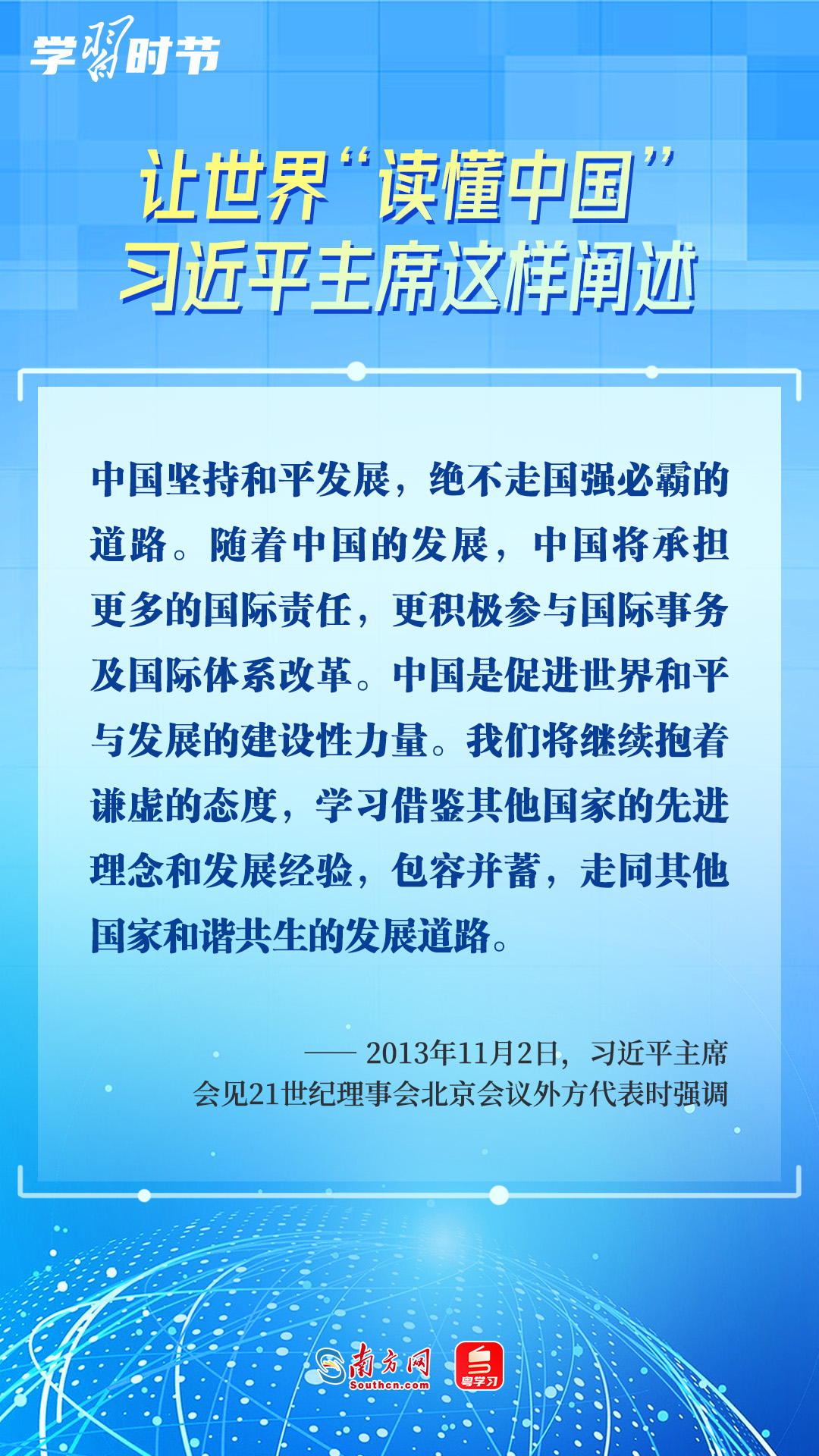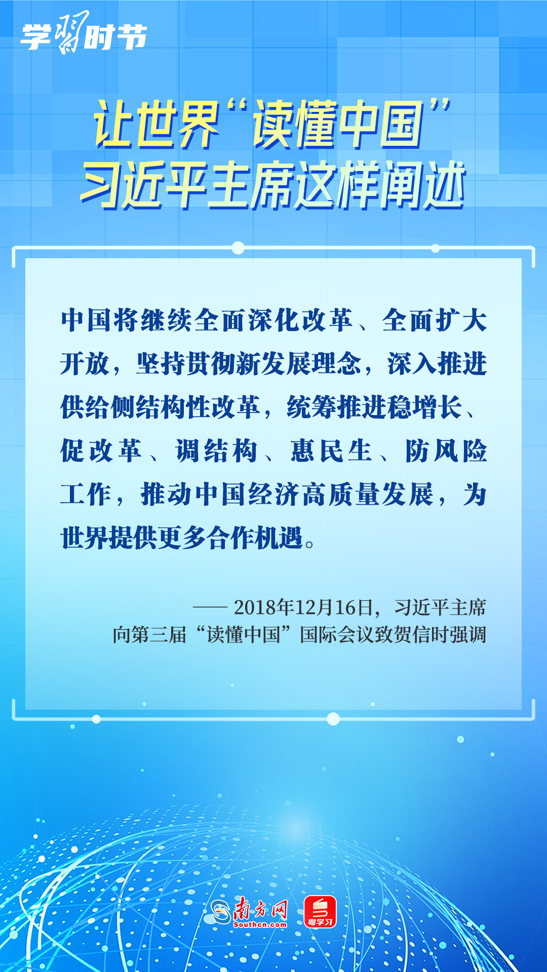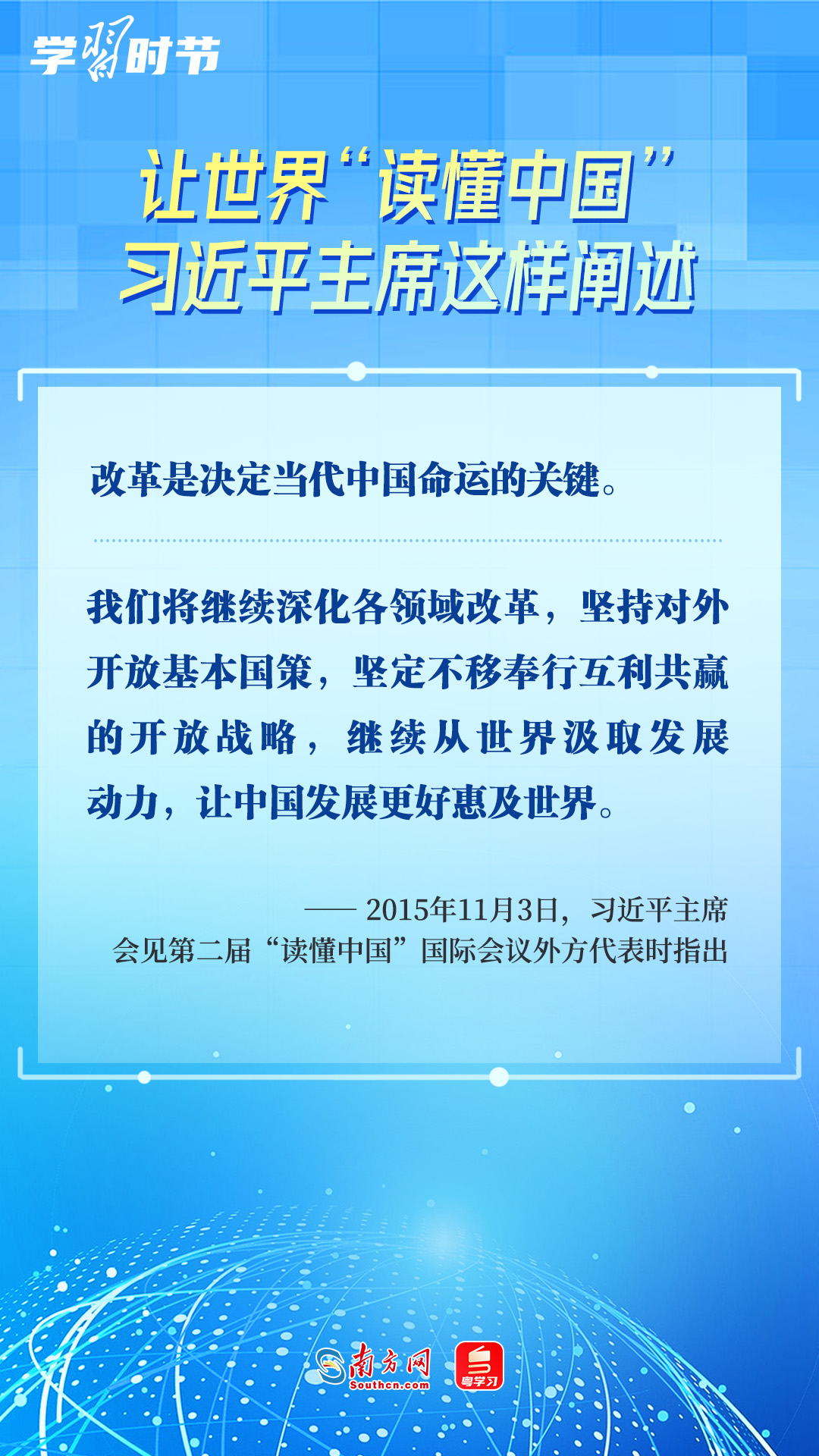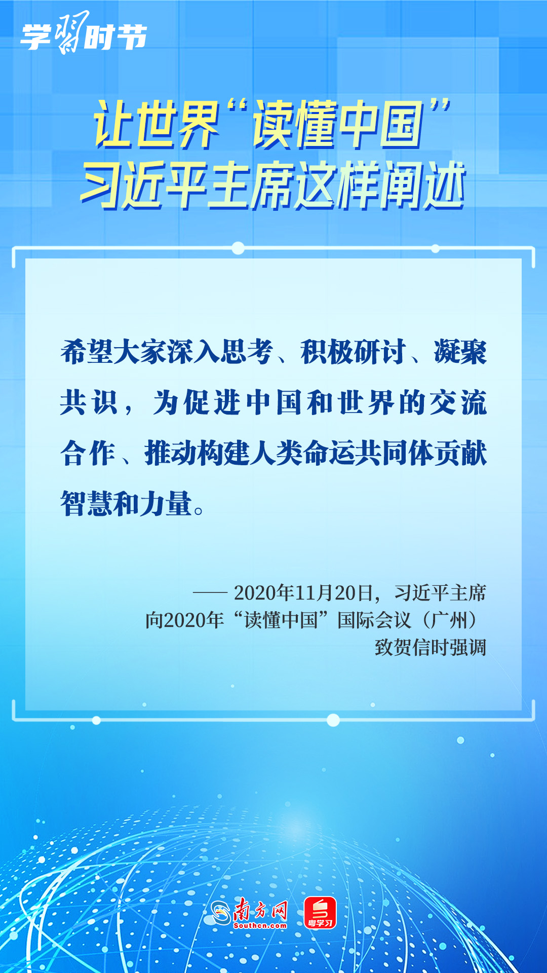 習(xí)近平主席高度重視“讀懂中國(guó)”國(guó)際會(huì)議,多次會(huì)見與會(huì)代表、向會(huì)議致辭或致賀信,闡述中國(guó)的發(fā)展道路、改革開放、對(duì)外政策等,讓我們一同學(xué)習(xí)。