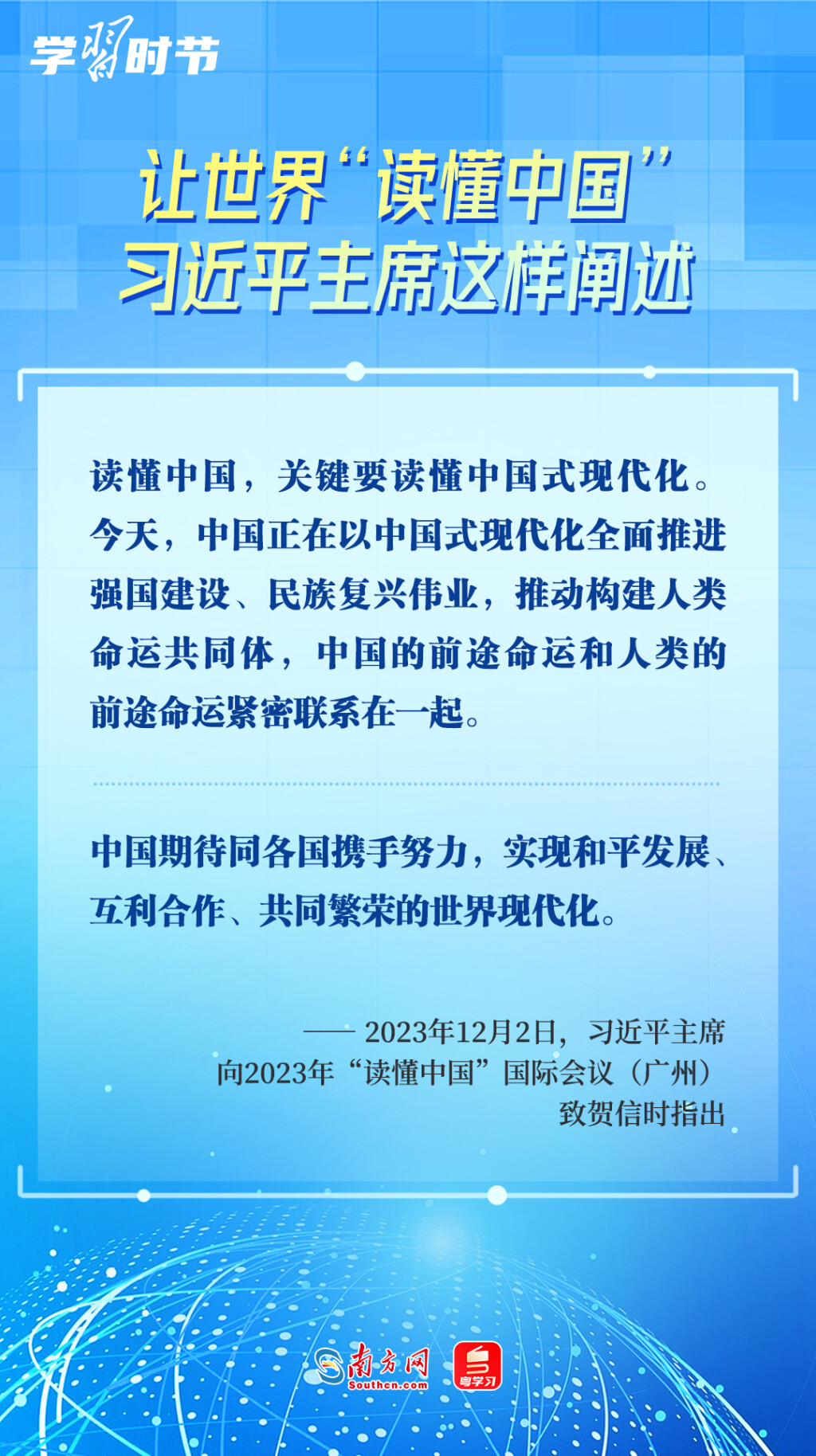 12月2日,2023年“讀懂中國(guó)”國(guó)際會(huì)議在廣州開幕,國(guó)家主席習(xí)近平向會(huì)議致賀信。習(xí)近平主席在賀信中指出,“讀懂中國(guó),關(guān)鍵要讀懂中國(guó)式現(xiàn)代化?!?/span>