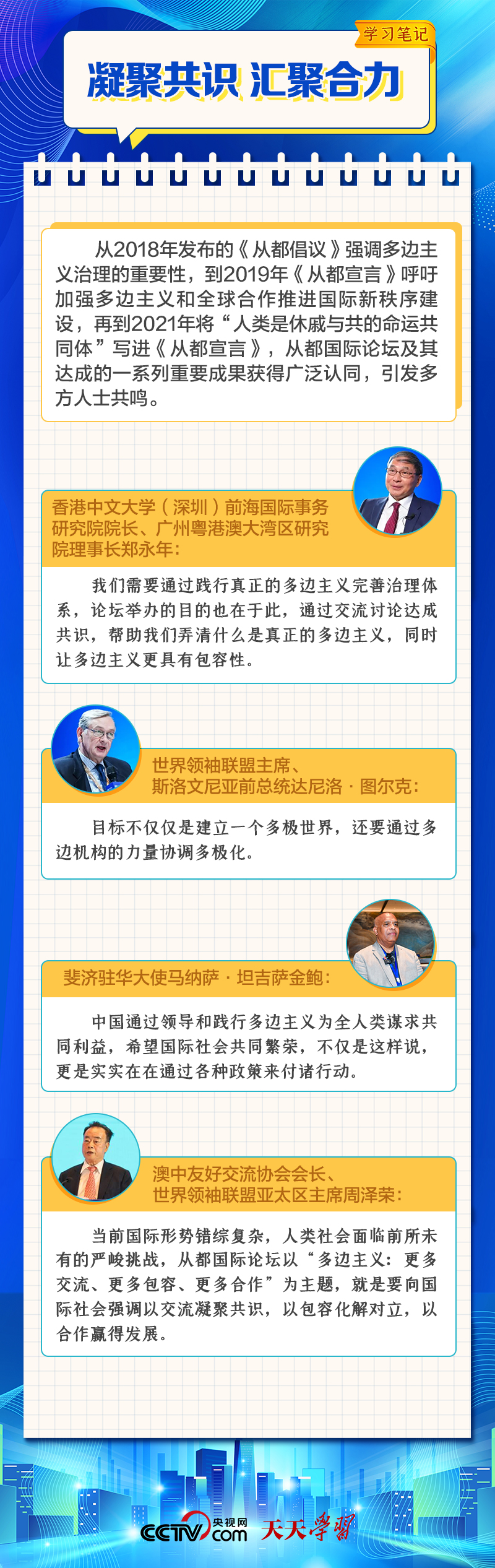 天天學習12月4日,習近平主席在致“2023從都國際論壇”的賀信中強調(diào),面對前所未有的世界之變、時代之變和歷史之變,人類社會必須團結(jié)起來,堅持互學互鑒、開放包容、合作共贏,弘揚全人類共同價值,共同建設(shè)更加美好的世界。