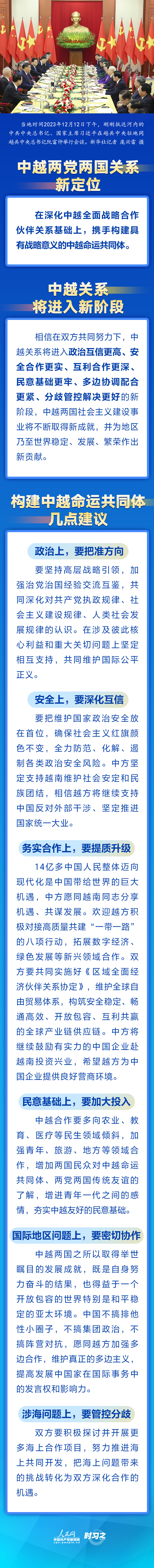 當(dāng)?shù)貢r(shí)間2023年12月12日下午,剛剛抵達(dá)河內(nèi)的中共中央總書記、國家主席習(xí)近平在越共中央駐地同越共中央總書記阮富仲舉行會談。雙方宣布中越兩黨兩國關(guān)系新定位,在深化中越全面戰(zhàn)略合作伙伴關(guān)系基礎(chǔ)上,攜手構(gòu)建具有戰(zhàn)略意義的中越命運(yùn)共同體。