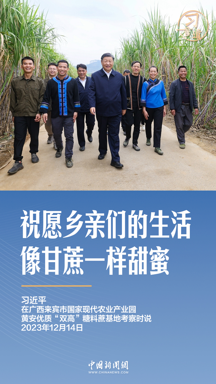 12月14日,在廣西來(lái)賓的甘蔗林里,習(xí)近平向蔗農(nóng)送上祝福:祝愿鄉(xiāng)親們的生活像甘蔗一樣甜蜜。