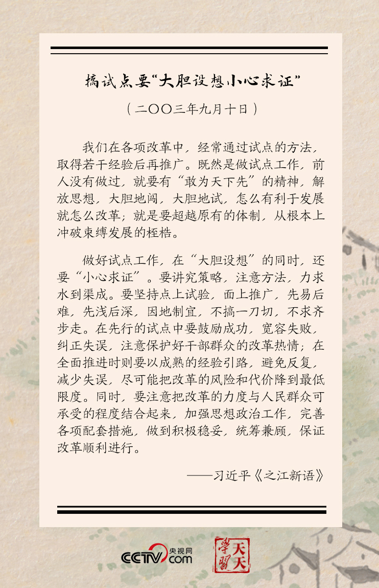 習近平還進一步分析,做好試點工作,在“大膽設想”的同時,還要“小心求證”……要堅持點上試驗,面上推廣,先易后難,先淺后深,因地制宜,不搞一刀切,不求齊步走……