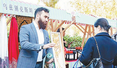 阿森貝克(左)在一場(chǎng)校園活動(dòng)中介紹烏茲別克斯坦手工藝品。