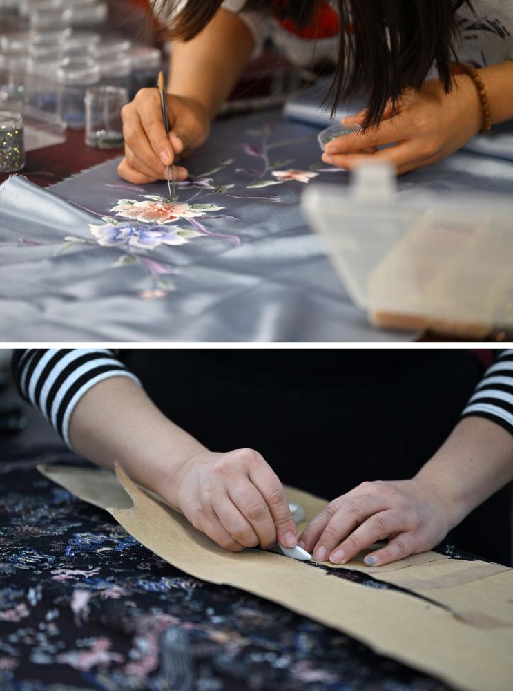 ??拼版照片:上圖為老美華定制車間的制衣師傅在面料上貼鉆;下圖為老美華定制車間的制衣師傅在面料上劃線(2023年12月8日攝)。天津老美華始創(chuàng)于1911年,歷史上以“千層底”布鞋聞名,是享譽津門的“中華老字號”。新華社記者 李然 攝