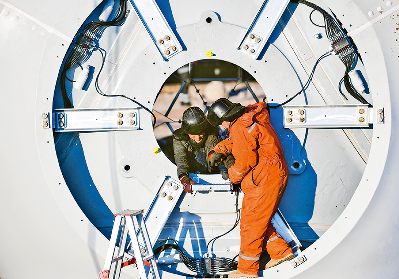河北承德豐寧風(fēng)光氫儲100萬千瓦風(fēng)光項(xiàng)目是國家“十四五”規(guī)劃的大型清潔能源基地——冀北清潔能源基地的標(biāo)志性工程。項(xiàng)目建成后,預(yù)計(jì)每年可生產(chǎn)綠電18億千瓦時,減少二氧化碳排放約140萬噸。圖為2024年1月12日,該項(xiàng)目的工人在安裝風(fēng)機(jī)輪轂配件。 新華社發(fā) 王立群/攝