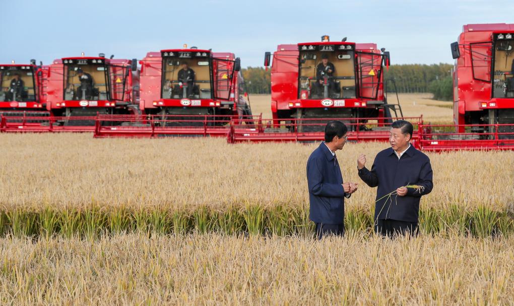 2018年9月25日,金秋時節(jié),稻浪滾滾,黑龍江農(nóng)墾建三江管理局七星農(nóng)場萬畝大地號豐收在望。習近平總書記走進正在收割的地塊,拿著稻穗,同工作人員交談,詳細了解糧食生產(chǎn)和收獲情況。