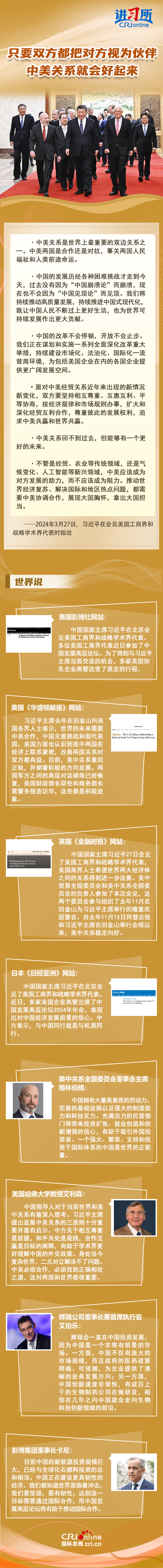 3月27日,中國國家主席習近平在北京會見美國工商界和戰(zhàn)略學術界代表時指出,中美各自的成功是彼此的機遇。只要雙方都把對方視為伙伴,相互尊重、和平共處、合作共贏,中美關系就會好起來。