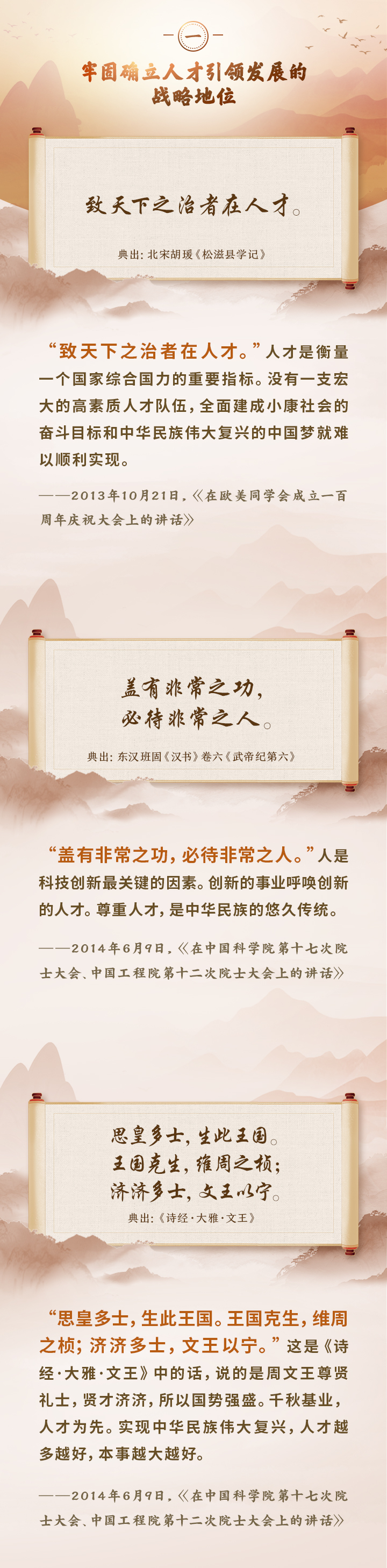 編者按:培養(yǎng)造就大批德才兼?zhèn)涞母咚刭|人才,是國家和民族長遠發(fā)展大計。黨的十八大以來,習近平總書記圍繞人才工作發(fā)表一系列重要論述,立意高遠,內(nèi)涵豐富,思想深刻,深刻回答了為什么建設人才強國、什么是人才強國、怎樣建設人才強國的重大理論和實踐問題。在這些重要論述中,總書記精妙運用古代典籍、經(jīng)典名句,以古喻今、啟迪思想、激蕩精神,讓我們一起來學習!