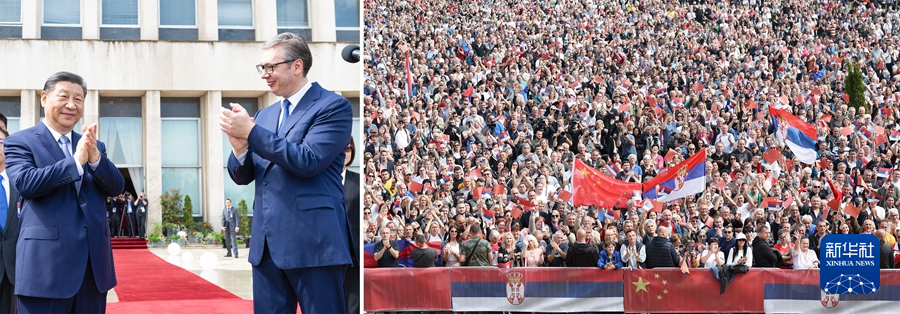 ??當(dāng)?shù)貢r間5月8日上午,國家主席習(xí)近平在貝爾格萊德塞爾維亞大廈同塞爾維亞總統(tǒng)武契奇舉行會談。會談前,武契奇陪同習(xí)近平來到政府大廈平臺(左圖)。大廈廣場上,一萬五千名塞爾維亞民眾揮舞中塞兩國國旗,對習(xí)近平表示最熱烈的歡迎(右圖)。(拼版照片) 新華社記者 黃敬文 丁海濤 攝