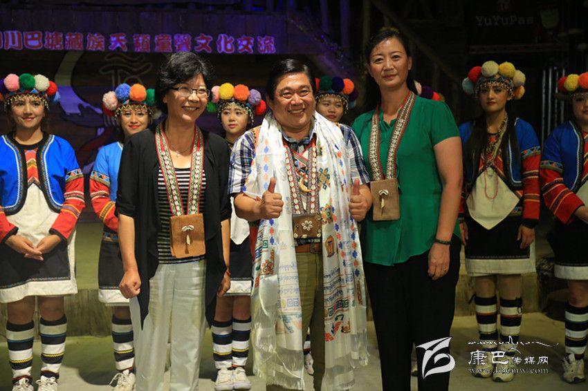 巴塘縣委常委、宣傳部長(zhǎng)張平樹,縣政府副縣長(zhǎng)王文英,優(yōu)游吧斯股份有限公司董事長(zhǎng)鄭虞坪與高山族演員合影。