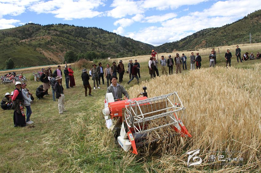 9月14日,在海拔3600多米的理塘縣甲洼鄉(xiāng)下依村成熟青稞地里,縣農(nóng)牧和科技局的農(nóng)機(jī)手正用小型聯(lián)合收割機(jī)示范收割青稞。7個(gè)行政村的村支書、村主任在現(xiàn)場(chǎng)觀摩學(xué)習(xí)。俄曲村支書洛真說:“這個(gè)小型聯(lián)合收割機(jī)很適合我們高原,這將大大減輕我們的勞動(dòng)強(qiáng)度,不用再擔(dān)心下雨影響搶收。” (葉強(qiáng)平 攝影報(bào)道)
