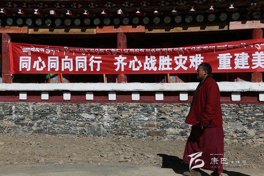 記者注意到,在金龍寺大門處的圍墻上貼著一面寫有“同心同向,共渡難關,重建家園”的紅色橫幅,一位僧人口中念念有詞,走過橫幅,向新搭建的救災帳篷走去,另一位僧人則拿著一柄鋤頭走出寺院大門,隨同另一批救災人員去處理前幾日垮塌在地的石頭。