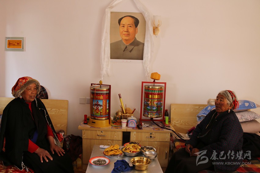 從餐廳出來,記者走進了一間15平方米左右的宿舍。兩位老人正坐在各自的木床上看電視,墻上掛著的液晶電視是連著機頂盒的。兩床之間,放著藏桌和床頭柜,藏桌上有瓜子、花生、酥油果子、牛肉等食品,亞瑪翁青老人熱情地說:“因為正在過藏歷新年,這些都是福利院為我們備的年貨,你也嘗嘗!”。房間里最引人注目的便是掛在床頭柜上方的系著哈達的毛主席畫像,兩位老人指著毛主席畫像動情地說:“毛主席、共產(chǎn)黨是我們的恩人,看著他的畫像我們安心?!贝送猓块g里還有衣柜、配有馬桶的獨立廁所和盥洗臺,毛巾、漱口盅、掃把、拖把都整齊地放在對應(yīng)位置。亞瑪翁青笑著說:“我們住的房間都趕得上縣城里的賓館了?!?/span>