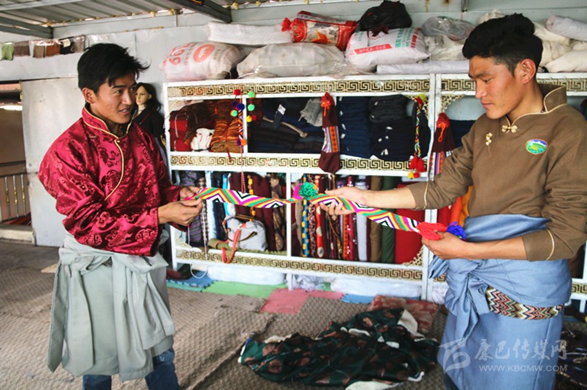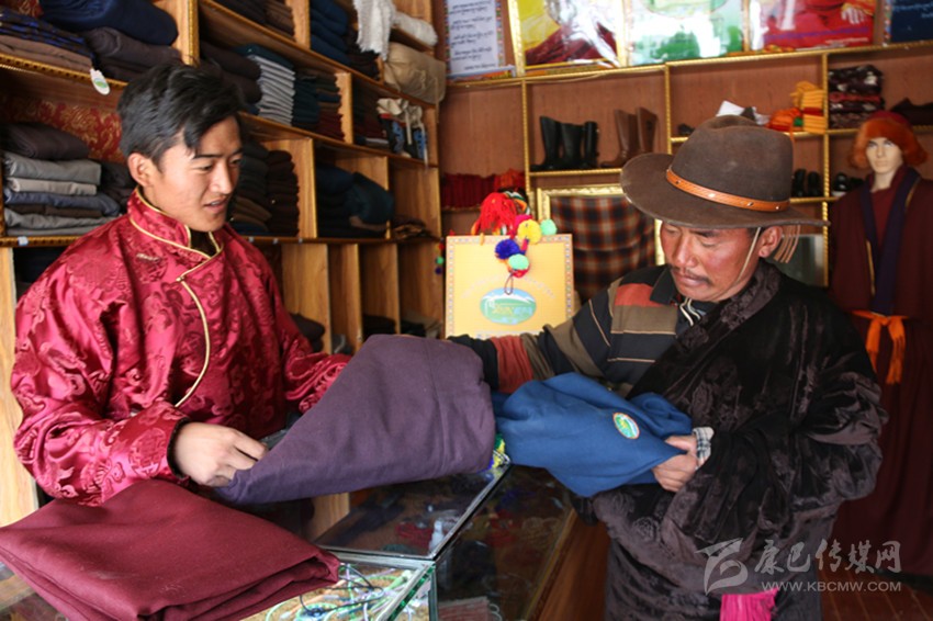 安孜鄉(xiāng)作為白玉縣海拔較高的鄉(xiāng)鎮(zhèn)之一,夏天是十分短暫的,連日來的晴好天氣,也透著絲絲寒氣。牧民阿剛想要量身定做一套過冬的藏裝,8月26日,他來到白玉縣阿察鎮(zhèn),一家民族服飾商貿(mào)公司吸引了他的目光?!拔覀冞@里的服裝面料是本地羊毛和從浙江進的上等面料,做工考究,很多工序是純手工制作,服裝樣式你可以根據(jù)你的喜好指定,我們包你滿意。”店員仁真熱情地介紹。聽了仁真的介紹,阿剛用手捻了一下服裝用料的質(zhì)地,看到印有“祥陽措”商標(biāo)的精美包裝袋,商店里擺放的五彩斑斕、高端大氣的藏式男女服裝,他有些動心了?!吧a(chǎn)這些服裝的都是我們納塔鄉(xiāng)的牧民,你可以考察我們的服裝用料、生產(chǎn)流程,再作打算。”仁真熱情洋溢地介紹說。