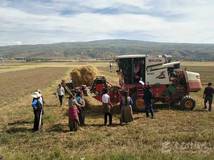 近日,在甘孜縣仁果鄉(xiāng),兩臺(tái)收割機(jī)來(lái)回穿梭,一片片金色的青稞倒下卷入,一粒粒飽滿的果實(shí)傳送出來(lái)……在場(chǎng)的人們臉上都露出了喜悅的笑容,歡聲笑語(yǔ)響徹田野。