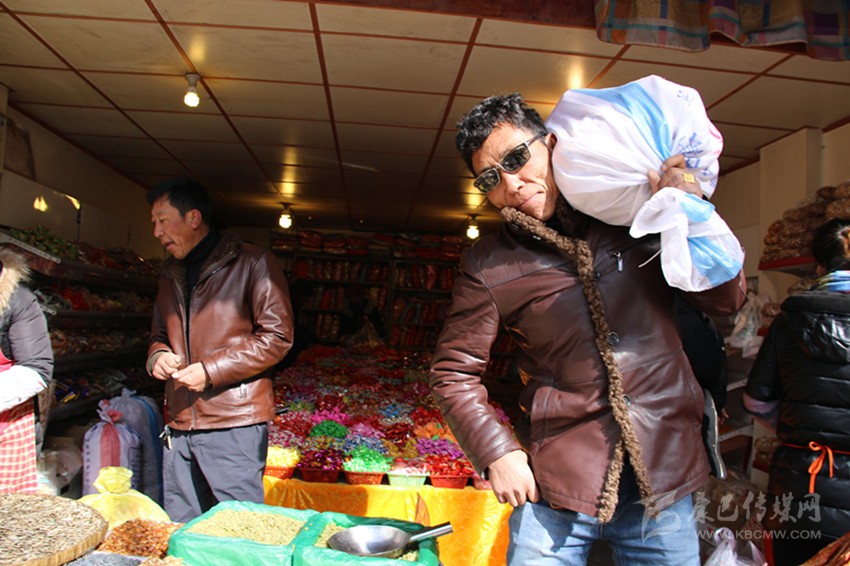 走進郭達橋重康糖果店,洛讓說:“多買點糖果糕點,娃娃老婆喜歡?!比缓笳諉吸c貨:花生10斤、瓜子5斤、葡萄干5斤、水果糖5斤、軟糖5斤、炒米糖10斤……一下就指點了八九種糖果糕點。看到了這樣的生意,老板樂開了花。與洛讓大包大攬的氣派不同,長期經商的扎西老練地詢價:“老板,我們買這么多,要優(yōu)惠喲。”一番討價還價之后,洛讓和扎西買了十種糖果,用去1066元,裝滿整整兩編織袋。洛讓把糖果過扛在肩上,對筆者說:“你來試一下,有點分量,你別說,辦年貨也是一種體力活喲?!?/p>