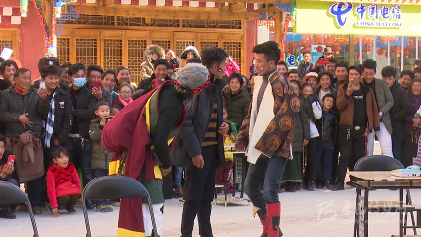 上午11點,歡快的音樂在小學操場上響起,演出正式開始。村民們圍坐在操場上,人頭攢動、彩幡飛舞、陽光正好。13個節(jié)目依次上演,包括男女群舞、女子群舞、男子合唱、女子合唱、男女獨唱,最有特色的是得榮本地特色群舞《雪域鍋莊》和《九步情》。