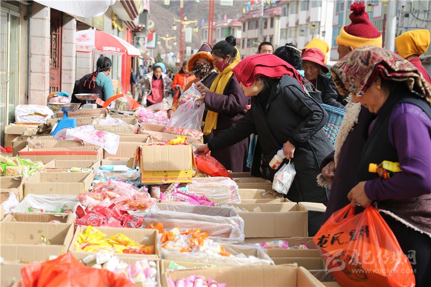 新都鎮(zhèn)格色村的丹真大哥和老伴兒其吉牽著8歲的孫子正在干果店里挑選各類干果,身后的背簍里水果、蔬菜、酥油、牛肉等農(nóng)畜產(chǎn)品以及中國結(jié)、年畫、對(duì)聯(lián)、掛圖等吉祥的節(jié)日物品應(yīng)有盡有。