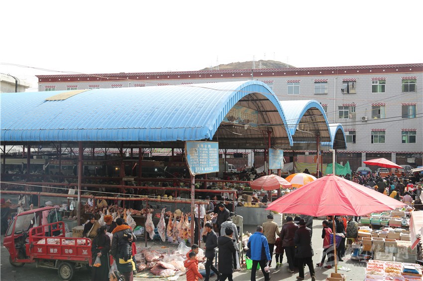 走進(jìn)康北農(nóng)貿(mào)市場,筆者看到,一捆捆新鮮的綠色蔬菜、一塊塊剛剛宰好的牦牛肉、一箱箱水果整齊地?cái)[放在臺(tái)案上吸引著過往農(nóng)牧民群眾的眼球。不大的市場里熱鬧非凡,大家有人正忙著選購牛肉、水果和糖等年貨,有人正把一箱箱包裝好的年貨往車上搬運(yùn)。