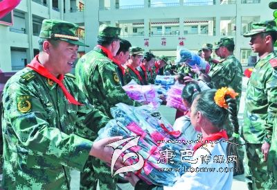 儀式上,8722部隊(duì)向?qū)W校贈送了價值萬余元的學(xué)習(xí)用品,拿著裝有鉛筆、水彩筆等各種文具的“愛心書包”,孩子們興奮不已。12歲的藏族女生登真啟珍告訴筆者:“今年的‘六一’兒童節(jié),武警部隊(duì)的叔叔們專門來看望我們,還送來了禮物,我感到特別開心。”儀式上,少先隊(duì)員們給參加慰問的部隊(duì)領(lǐng)導(dǎo)戴上鮮艷的紅領(lǐng)巾,孩子們還表演了精心排練的節(jié)目。一張張燦爛的笑臉,一陣陣蕩漾心扉的歌聲,傳遞著駐訓(xùn)武警部隊(duì)與當(dāng)?shù)厝罕姖鉂獾聂~水深情。
