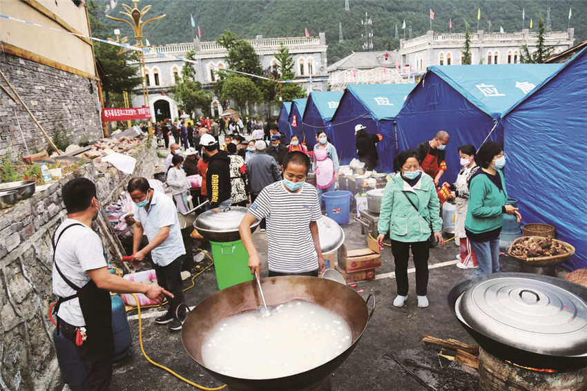 這是來之不易的“百家飯”,在“9·5”瀘定縣6.8級(jí)地震發(fā)生后,受災(zāi)村民你拿一袋米、我提一筐菜,你出一份力、我捐一點(diǎn)錢,齊心協(xié)力、共渡難關(guān),520人共煮一鍋“團(tuán)結(jié)飯”。