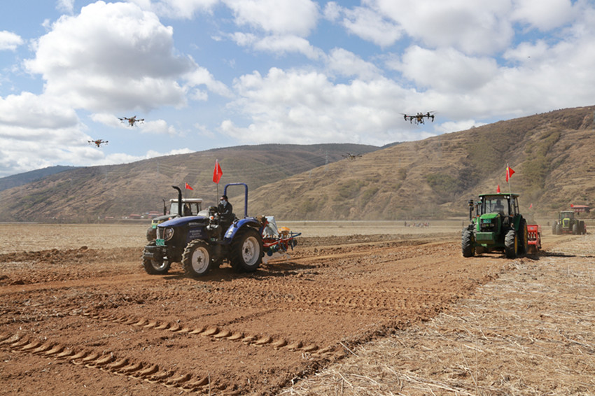 隨著一聲擲地有聲的“開耕……”,十余輛大型農(nóng)機具緩緩入地,現(xiàn)場為大家展示了青稞全程機械化作業(yè)。20臺免耕播種機、約翰迪爾1354輪式拖拉機等機具在農(nóng)機手熟練操控下,旋耕、播種、覆土、鎮(zhèn)壓一次完成,無人機飛舞在天空,噴灑著農(nóng)藥,一幅現(xiàn)代版鐵?!按焊备偧紙D躍入眼簾,在場人員紛紛掏出手機、相機拍攝記錄下這富有“科技感”的畫面。