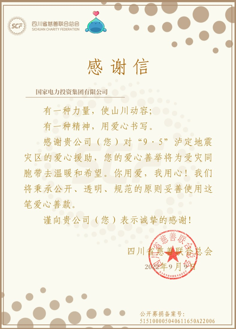 2022年9月5日12時52分,瀘定6.8級地震發(fā)生后,國家電投集團(tuán)立刻向災(zāi)區(qū)捐款1000萬元,全力支援災(zāi)區(qū)救助和災(zāi)后重建,幫助災(zāi)區(qū)人民共渡難關(guān)。面對災(zāi)情,國家電投甘孜興川公司迅速啟動地震應(yīng)急響應(yīng),做好人員、設(shè)備詳細(xì)排查,防范塌方、泥石流等次生災(zāi)害,保持安全生產(chǎn)穩(wěn)定,千方百計保安全、保供電,充分發(fā)揮央企能源供應(yīng)“穩(wěn)定器”和“壓艙石”作用,助力災(zāi)區(qū)盡快恢復(fù)生產(chǎn)生活秩序。統(tǒng)籌調(diào)度各方力量,克服疫情和余震影響,緊急采購災(zāi)區(qū)急需的發(fā)電機(jī)、電筒等設(shè)備第一時間送達(dá)災(zāi)區(qū),支援應(yīng)急。在得知瀘定縣得妥鎮(zhèn)電力系統(tǒng)受災(zāi)嚴(yán)重急需救援力量后,公司迅速成立抗震救災(zāi)保供黨員先鋒隊,從正在緊張施工的興川實證光伏電站抽調(diào)精銳力量26人奔襲700公里,抵達(dá)瀘定縣得妥鎮(zhèn),緊急馳援地方搶險救災(zāi)工作,拆除100多戶危房電源,恢復(fù)2個行政村460戶村民安全用電,贏得當(dāng)?shù)卣蜕鐣鹘缫恢潞迷u。