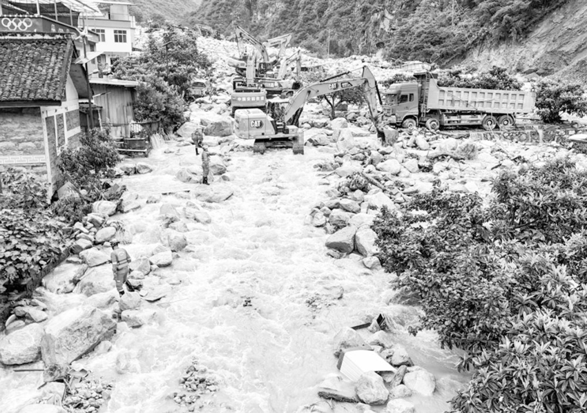 8月4日,在康定市姑咱鎮(zhèn)日地村,救援人員操作機(jī)械疏通國道318線。 新華社記者 劉坤 攝