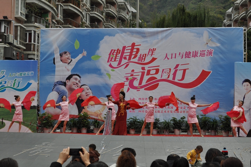 舞臺上“健康相伴•幸福同行”大型演出背景格外醒目,由省虹宇藝術(shù)團(tuán)自編自演的舞蹈《歌舞青春》、金錢板《怪哪個(gè)》、小品《你生不生》、四川清音《分級診療就是好》、雜技《烏依人》、戲曲《天府奇葩》等節(jié)目陸續(xù)登場。演員們通過戲曲、歌曲等形式,向廣大觀眾傳播衛(wèi)生計(jì)生新政策,臺下各縣屬醫(yī)療衛(wèi)生計(jì)生機(jī)構(gòu)醫(yī)務(wù)人員免費(fèi)開展義診活動,為廣大群眾查血壓、詢問病史、咨詢等忙個(gè)不停,群眾與演員互動場面感人。演出活動取得良好的教育效果,得到廣大群眾的熱烈歡迎。
