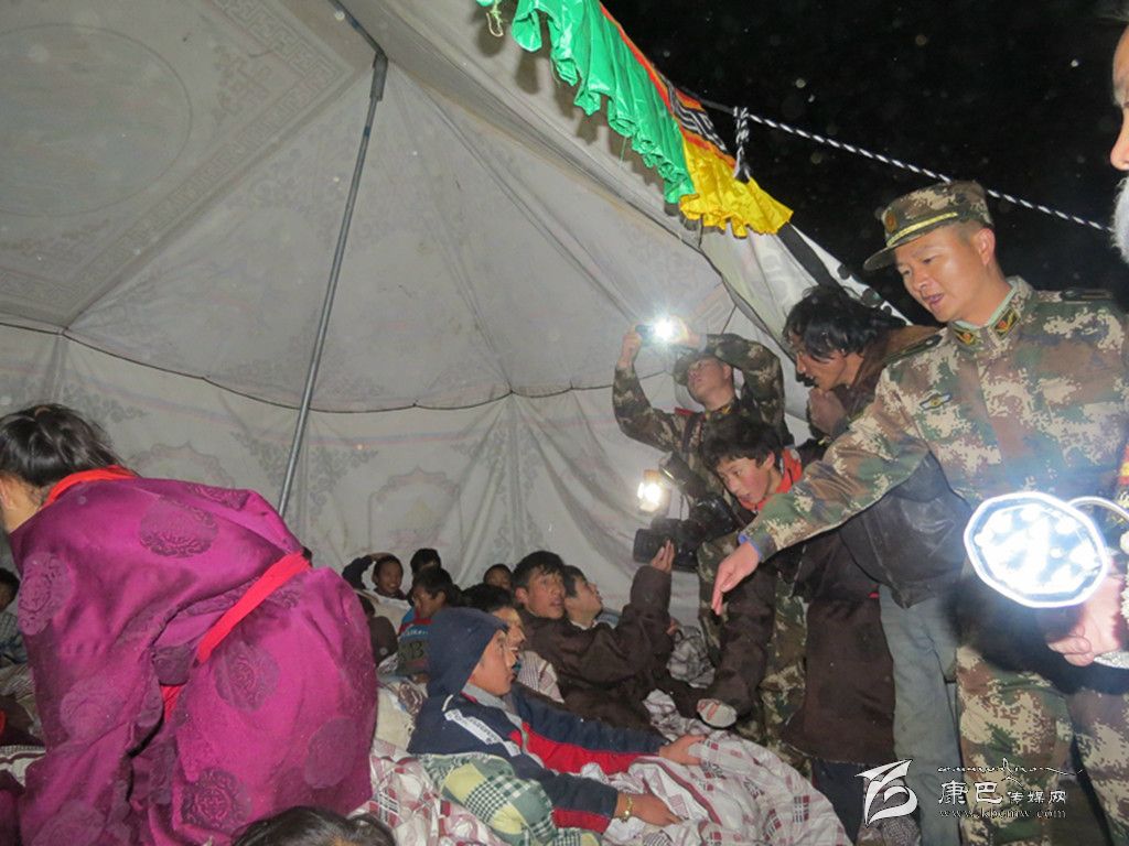 23日凌晨2時(shí)許,當(dāng)木雅祖慶學(xué)校安置點(diǎn)所有師生和群眾入住帳篷后,官兵們開(kāi)始為85頂帳篷里的群眾逐一發(fā)放棉衣、棉被等救災(zāi)物資。“我不想住這里!我要回家,這里會(huì)垮掉……”15歲的八年級(jí)學(xué)生索讓還未從地震陰影中走出來(lái),驚魂未定的他不聽(tīng)老師和同學(xué)們的勸告,執(zhí)意要“逃離”安置點(diǎn)。高俊帶領(lǐng)軍醫(yī)及時(shí)趕來(lái)安撫索讓?zhuān)?ldquo;有武警叔叔在,不怕……”高俊摟著索讓的肩耐心地安撫著,當(dāng)他輕撫其額頭時(shí)發(fā)現(xiàn)索讓有些發(fā)燒,便立即安排軍醫(yī)為其服藥并物理退燒,直到其安然入睡才悄悄離去。