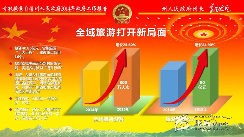 全域旅游打開(kāi)新局面。投資40.83億元,實(shí)施旅游“十大工程”,建設(shè)重點(diǎn)項(xiàng)目16個(gè)。制定幸福美麗示范新村旅游導(dǎo)則,實(shí)施鄉(xiāng)村旅游“提升行動(dòng)”;稻城、鄉(xiāng)城鄉(xiāng)村旅游示范縣和海螺溝創(chuàng)建5A級(jí)景區(qū)實(shí)施方案通過(guò)省級(jí)評(píng)審,海螺溝創(chuàng)國(guó)家級(jí)、稻城亞丁創(chuàng)省級(jí)生態(tài)旅游示范區(qū)全面啟動(dòng);評(píng)選首批“最康巴——特色名店”57家。新增重慶、西安、瀘州至亞丁3條航線,亞丁機(jī)場(chǎng)開(kāi)航一年來(lái),游客達(dá)18萬(wàn)人次。全州接待游客800萬(wàn)人次,實(shí)現(xiàn)旅游綜合收入80億元,分別增長(zhǎng)25.6%和24.9%。全域旅游更加深入人心,旅游業(yè)正成為我州經(jīng)濟(jì)發(fā)展的“助推器”、群眾增收的“搖錢樹(shù)”。
