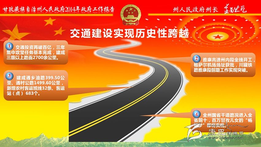 交通建設(shè)實(shí)現(xiàn)歷史性跨越。交通投資再破百億,建成三級(jí)以上路面2700余公里。雅康高速州內(nèi)段全線開(kāi)工,格薩爾機(jī)場(chǎng)場(chǎng)址獲批,川藏鐵路雅康段前期工作實(shí)現(xiàn)突破。建成通鄉(xiāng)油路399.5公里、通村公路1499.6公里,新增農(nóng)村客運(yùn)班線32條、客運(yùn)站(點(diǎn)) 683個(gè)。全州國(guó)省干道路況進(jìn)入全省前十。徹底告別無(wú)電鄉(xiāng)歷史。完成投資100億元,“電力天路”等項(xiàng)目順利實(shí)施,“川藏聯(lián)網(wǎng)” 工程提前半年建成投運(yùn);18個(gè)縣實(shí)現(xiàn)與主網(wǎng)連網(wǎng);“遠(yuǎn)村點(diǎn)亮”全面完成。城鄉(xiāng)面貌煥然一新。堅(jiān)持建好縣城,全州市政基礎(chǔ)設(shè)施有效提升。堅(jiān)持做大集鎮(zhèn),改造小城鎮(zhèn)危舊房1118戶;投入1.34億元完善姑咱、馬尼干戈、香格里拉、八美4個(gè)省級(jí)“百鎮(zhèn)試點(diǎn)”鎮(zhèn)市政設(shè)施,13個(gè)鄉(xiāng)獲準(zhǔn)撤鄉(xiāng)建鎮(zhèn)。堅(jiān)持做美村寨,成功創(chuàng)建45個(gè)省級(jí)“美麗鄉(xiāng)村”示范村,19個(gè)州級(jí)幸福美麗新村試點(diǎn)建設(shè)全面啟動(dòng),打造新村聚居點(diǎn)235個(gè),建成藏區(qū)新居1.11萬(wàn)戶。全州城鎮(zhèn)化率達(dá)到27%。通信覆蓋越來(lái)越廣。完成投資4.53億元,國(guó)省干線和主要旅游景區(qū)通信網(wǎng)絡(luò)實(shí)現(xiàn)連續(xù)覆蓋。生態(tài)底色更加鮮明。編制完成《甘孜州生態(tài)文明建設(shè)規(guī)劃》,落實(shí)國(guó)家生態(tài)功能區(qū)轉(zhuǎn)移支付資金6.8億元,生態(tài)保護(hù)與建設(shè)工程加快推進(jìn),草原植被、森林覆蓋率分別達(dá)到78%、33.04%。
