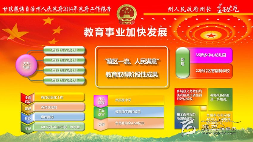 加大民生投入,全年民生支出139億元。全州城鎮(zhèn)新增就業(yè)7400人,城鄉(xiāng)低保實(shí)現(xiàn)應(yīng)保盡保;在全省民族地區(qū)率先實(shí)施醫(yī)療保險(xiǎn)制度城鄉(xiāng)統(tǒng)籌,異地就醫(yī)即時(shí)結(jié)算全面啟動(dòng);在全省率先出臺(tái)大病醫(yī)療保險(xiǎn)規(guī)定。教育事業(yè)加快發(fā)展。新建35所鄉(xiāng)中心幼兒園、22所片區(qū)寄宿制學(xué)校,州高級(jí)中學(xué)開(kāi)工建設(shè)。全面落實(shí)教育助學(xué)惠民政策,兌現(xiàn)各類補(bǔ)助金4.58億元。城鄉(xiāng)居民基本醫(yī)保參保率達(dá)到99.13%,健康檔案建檔率達(dá)到92%;開(kāi)工建設(shè)120個(gè)標(biāo)準(zhǔn)化鄉(xiāng)(鎮(zhèn))衛(wèi)生院和225個(gè)村衛(wèi)生室;衛(wèi)生信息化建設(shè)一期工程和遠(yuǎn)程會(huì)診、教學(xué)系統(tǒng)建設(shè)基本完成;兌現(xiàn)計(jì)劃生育“三項(xiàng)惠民制度”資金1809萬(wàn)元。群眾文化生活日益豐富。建成縣“兩館”12個(gè);開(kāi)工建設(shè)州民族體育館、州農(nóng)牧民演藝培訓(xùn)中心和14個(gè)縣級(jí)全民健身中心,建成農(nóng)民體育健身工程739個(gè);開(kāi)展 “送文化下鄉(xiāng)”近千場(chǎng);康巴文化研究院“四大工程”全面啟動(dòng)。深入實(shí)施“百千萬(wàn)康巴英才工程”,人才科技工作扎實(shí)有效。扶貧移民工作成效明顯。完成1360個(gè)貧困村、19.91萬(wàn)扶貧對(duì)象立卡建檔工作;實(shí)施整村推進(jìn)63個(gè)、連片開(kāi)發(fā)項(xiàng)目4個(gè)、彝家新寨(村)17個(gè)、索改橋23座,易地扶貧搬遷9850人,2.65萬(wàn)群眾生產(chǎn)生活條件得到改善。