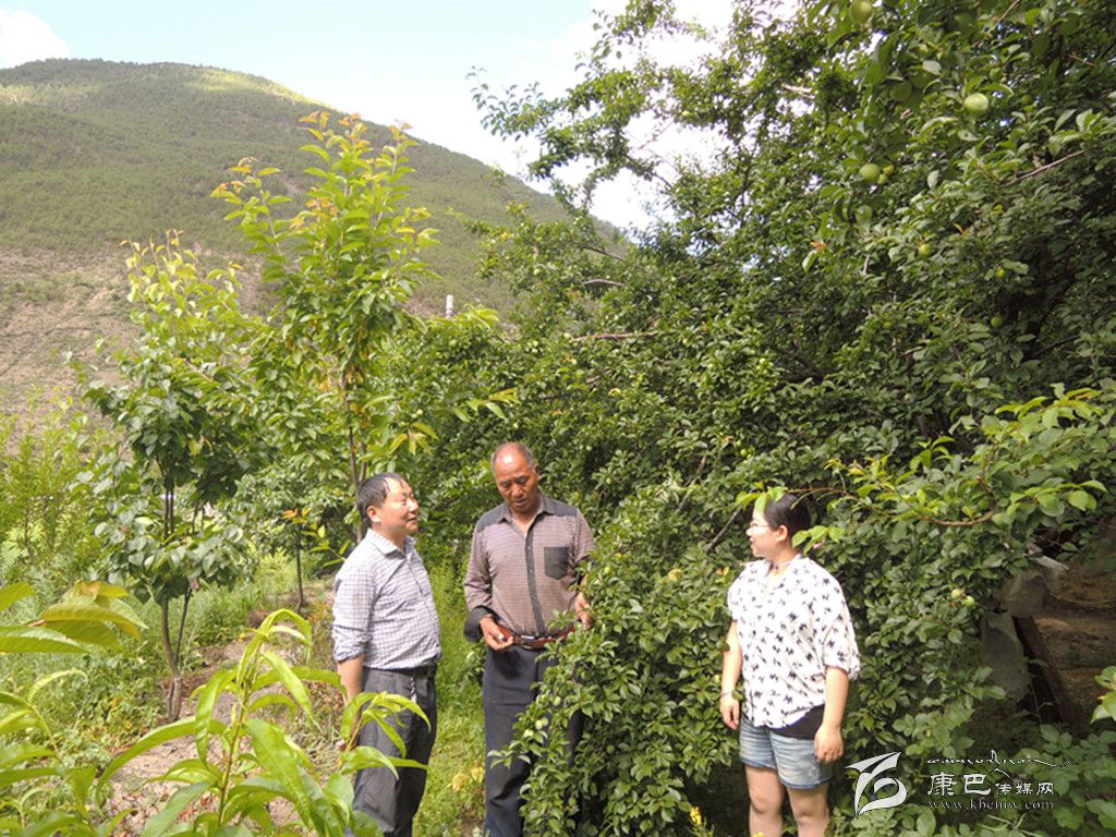 著木格絨在向農(nóng)技人員請(qǐng)教果木嫁接技術(shù)。