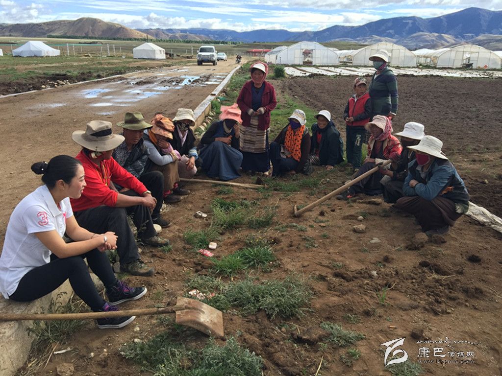 鄉(xiāng)黨委書(shū)記使朗擁忠(左一)了解村民在圣地農(nóng)莊打工及學(xué)習(xí)蔬菜種植情況︒ 葉強(qiáng)平 攝