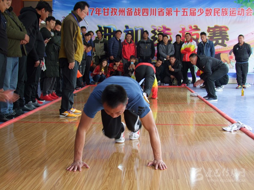 “在地上劃兩條平行線作為河界,中間劃一條中界,準(zhǔn)備一條長(zhǎng)約4米的繩子式布帶并兩端打結(jié)。比賽進(jìn)行時(shí),雙方各自把繩子套在脖子上,兩人相背,將賽繩經(jīng)過(guò)腹胸部從襠下穿過(guò),然后趴下,雙手著地,賽繩拉直,聽(tīng)到比賽開(kāi)始的口令后,兩人用腿腰肩頸的力量拖動(dòng)布帶奮力向前爬,以將紅布標(biāo)志拉過(guò)河界者為勝。押加是在藏區(qū)特殊的自然環(huán)境和獨(dú)特的民族生活習(xí)俗基礎(chǔ)上產(chǎn)生的,在第一屆至第五屆全國(guó)民族運(yùn)動(dòng)會(huì)中押加為表演項(xiàng)目,1999年第六屆全國(guó)民族運(yùn)動(dòng)會(huì)上押加被正式定為競(jìng)賽項(xiàng)目?!笨吹接^眾們對(duì)押加比賽充滿了好奇,教練員呂長(zhǎng)林主動(dòng)介紹說(shuō)。