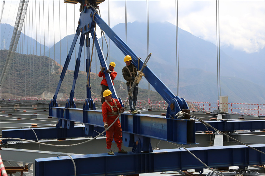 興康特大橋作為高海拔、高地震烈度山區(qū)和復(fù)雜風(fēng)場環(huán)境下世界第一超大跨徑鋼桁梁懸索橋,面臨的最現(xiàn)實(shí)的困難就是復(fù)雜風(fēng)場。4月1日下午,大橋建設(shè)現(xiàn)場連綿不絕的大風(fēng)如期而至,工人們系上安全繩,迎著大風(fēng),對新吊裝的材料一個(gè)螺絲一個(gè)螺絲的擰緊。