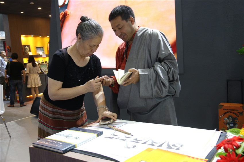而在同一地點(diǎn)的另一側(cè),省級(jí)藏文書法傳承人巴松鄧珠的藏文書法也吸引著眾多愛好書法市民前來(lái)觀賞,還有的與他合影。“指導(dǎo)過(guò)我的書法家非常多,他們不僅給了我許多寶貴的意見,更重要的是給了我信心和動(dòng)力,讓我堅(jiān)持寫書法,并成為康體藏文書法的傳承人?!卑退舌囍檎f(shuō),這次能夠得到州委、州政府搭建的平臺(tái),我會(huì)珍惜好這次難得的機(jī)遇,把作品展示好、宣傳好,讓全國(guó)各地的人們更多地了解我州民族文化。