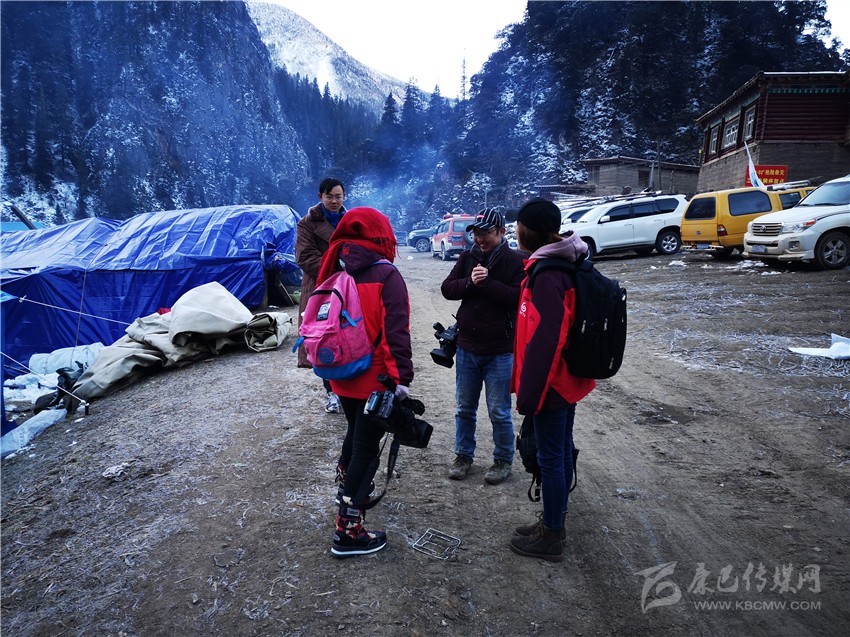 11月6日晚,甘孜日報記者馬建華、張磊、余秋林和州廣播電視臺副臺長何良忠、記者洛嘎、肯布及白玉電視臺記者連夜趕赴則巴村中轉(zhuǎn)站。26公里的崎嶇山路,冰雪道危險重重,坡陡彎急,司機憑借經(jīng)驗在坡度60度以上的暗冰道上行駛,經(jīng)過兩個多小時的艱難行進,采訪組終于入住前方救災組搭建的救災帳篷。深夜,大雪紛揚,帳篷里寒氣襲人。帳篷四周,狗叫聲不止,一條狗鉆進帳篷,蜷縮在記者床鋪旁邊,因為太冷,記者們不忍心將它驅(qū)離。11月7日,白格堰塞湖庫容量達到2.71億立方米,白格堰塞湖形勢嚴峻,嚴重威脅我州金沙江下游群眾生命財產(chǎn)安全。一大早,10多公分厚的大雪扮美了村莊,卻給機具、救災物資、救援人員進出等帶來極大困擾。“我們的挖掘機司機在山上被大雪困了一夜,徒步到中轉(zhuǎn)站休息了三個小時又到山上去作業(yè)了,你們應(yīng)該去采訪一下?!敝菡敝蓍L何康林說。