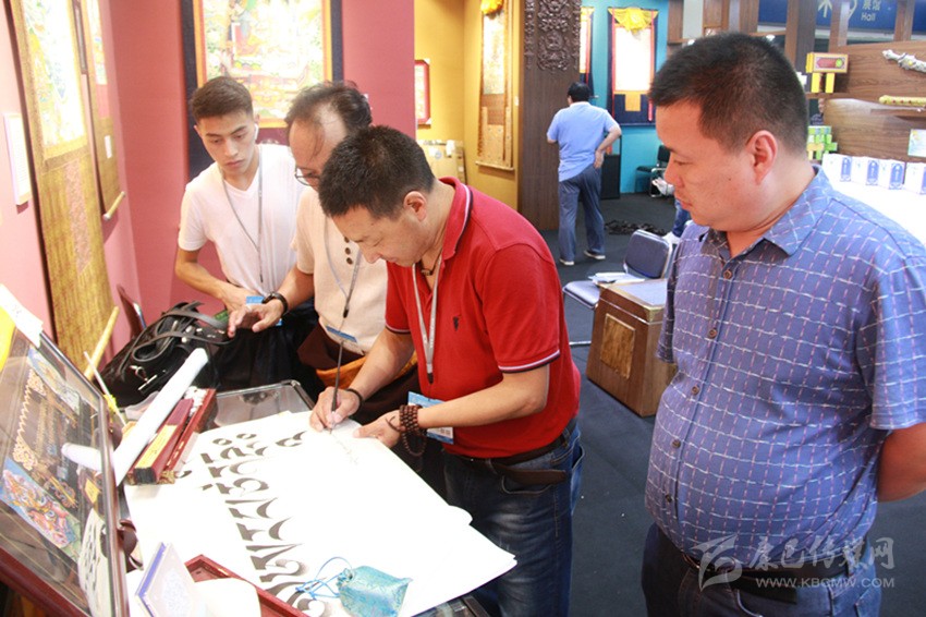 本屆文博會,巴松鄧珠帶來了一件藏文書法作品《格薩爾王》,讓現(xiàn)場觀眾嘖嘖稱贊。孫先生說:“把書法作品用藏族唐卡藝術(shù)的裝裱方式來裝裱,真讓我開了眼界。這件作品圖文并茂,真是太棒了,讓我覺得甘孜這個地方特別神圣,令人向往。我以后有機(jī)會不僅要好好練習(xí)藏文書法,還要去甘孜旅游?!?/p>