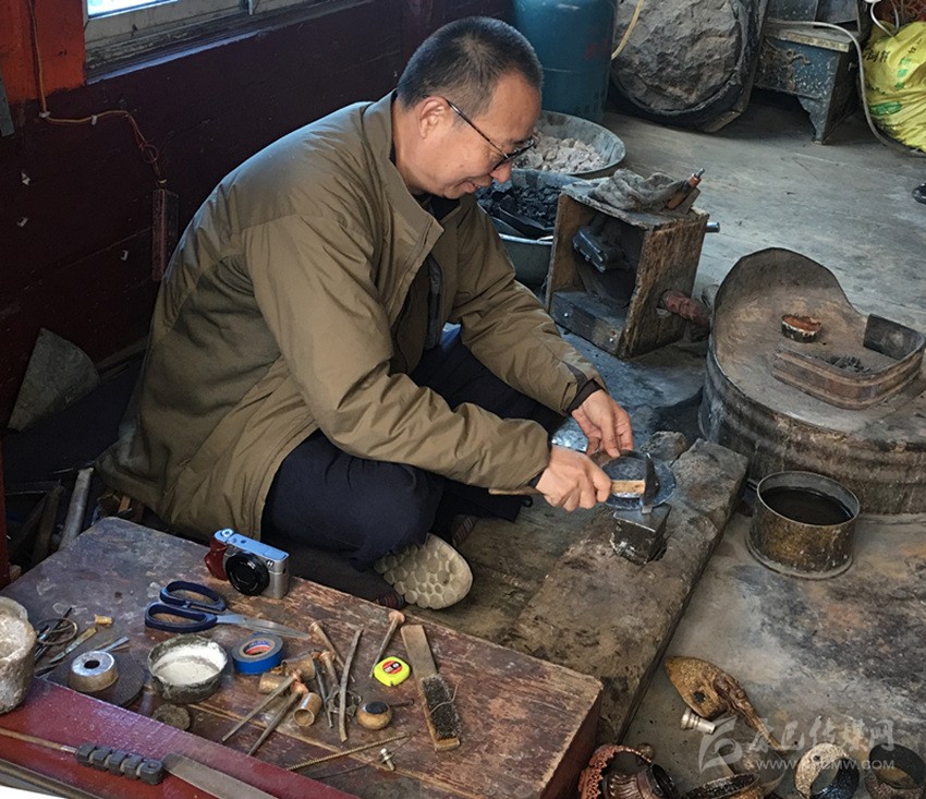 河坡民族金屬手工技藝歷史悠久,盛行于藏民族英雄嶺·格薩爾時期,至今大約有1300多年的歷史。調(diào)研組每到一處,都要與手工藝人們進行深入細致的交談。在手工藝傳承人布洛家中,見到了正在忙碌制作各種手工藝產(chǎn)品的場景,專家們立即拿出相機開始拍照。同時抑制不住激動的心情,參加到制作中去,有人一邊手持工具現(xiàn)場體驗河坡民族手工藝的鍛造,一邊饒有興致地說:“這里好似人間仙境,就如站在云端學手藝”。