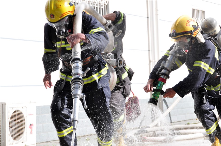“快點(diǎn)、快點(diǎn)、再快一點(diǎn)。”上午9時,爐城南路消防救援站消防員們身著15公斤戰(zhàn)斗服,帶著高壓水槍水帶,托著60公斤的人體模型,拼命奔跑,中隊長李勇不停地為隊員鼓勁?!皶r間就是生命,我們平時的訓(xùn)練就是在和時間賽跑,和死神賽跑?!崩钣赂嬖V記者,消防員對于體能要求極高,不僅要跑得快,還要負(fù)重跑?!拔覀儸F(xiàn)在的訓(xùn)練就是模擬火災(zāi)現(xiàn)場,消防員在滅火的同時,還要救出被困群眾。這樣的訓(xùn)練每天都會進(jìn)行,只有平時多流汗,戰(zhàn)時才少流血?!崩钣抡f。