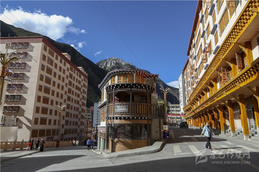 在德格縣馬尼干戈鎮(zhèn),整齊的藏房、干凈的街道與藍天白云相互映襯,構(gòu)成一幅整潔美麗的高原小城圖景。鎮(zhèn)上的個體戶劉敏站在商鋪前細細品味這幅圖景,若有所思。
