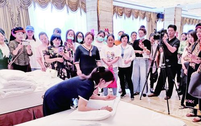 先檢查床箱與床墊是否吻合,床墊拉出40公分,鋪床前撣去床上毛發(fā),接下來(lái)開始甩單,床單正面朝上,床單中線居中,兩邊吊邊均等,甩單動(dòng)作簡(jiǎn)單瀟灑,準(zhǔn)確到位。這是7月8日,稻城縣文旅行業(yè)從業(yè)人員培訓(xùn)會(huì)上,筆者見到學(xué)員在教師的指導(dǎo)下表演的精彩一幕。