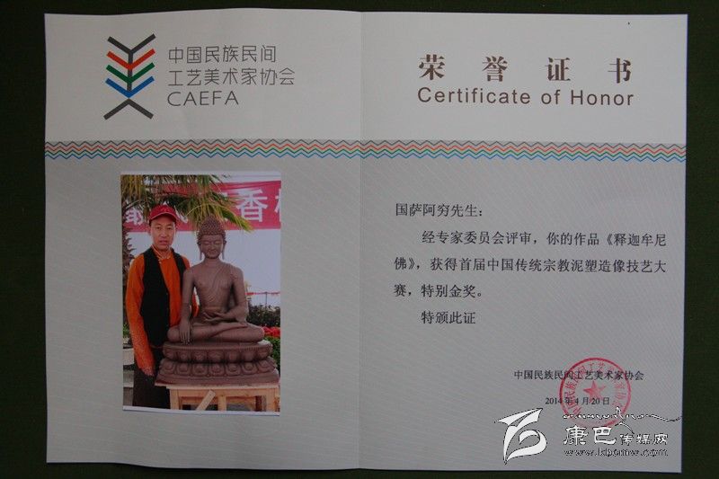 由中國民族民間工藝美術(shù)家協(xié)會主辦的“首屆中國宗教泥塑技藝大賽”,旨在傳承宗教泥塑造像技藝,搭建宗教造像藝術(shù)家展示平臺。本次大賽共有來自臺灣、香港、天津、河北、四川、西藏、云南、浙江、江蘇、貴州、江西、寧夏、江西等地的39名泥塑高手現(xiàn)場制作,角逐獎項(xiàng)。我州的國薩阿窮等三名藝人現(xiàn)場制作的泥塑作品《釋迦牟尼》榮獲特別金獎,同時,國薩阿窮還榮獲了“中國傳統(tǒng)工藝美術(shù)大師(宗教雕塑)”榮譽(yù)證書。