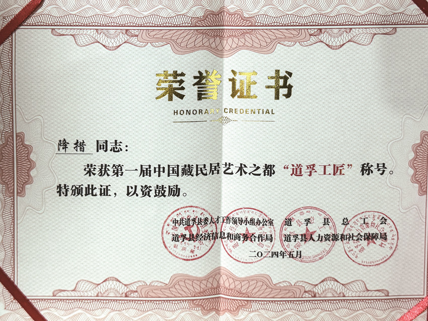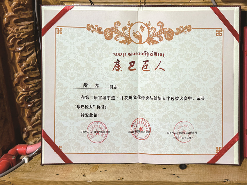 道孚縣孔色鄉(xiāng)瓦依村的降措從小酷愛藏紙文化,2008年,在降初扎巴老師處系統(tǒng)的學習了造紙工藝,2021年,獲得了州級非遺傳承人榮譽稱號,同年12月,在康巴文化大賽中獲得了“康巴匠人”榮譽稱號。