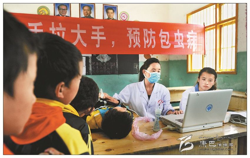 高原防控——醫(yī)務人員在預防包蟲病現場為學生檢查身體。